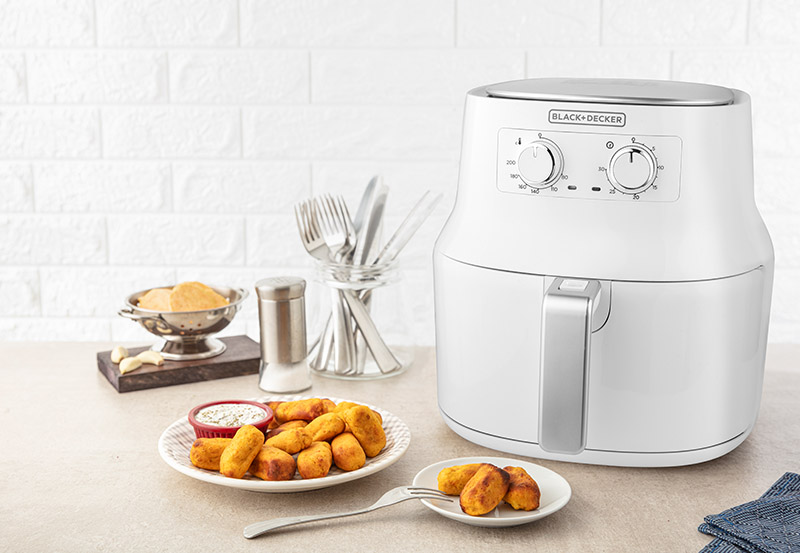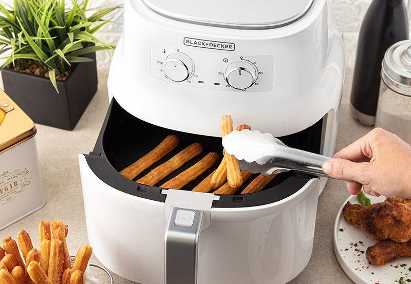 La freidora de aire de BLACK+DECKER® es la solución definitiva y saludable a tus antojos, ya que podrás cocinar papas, plátano, panes, pescado, carnes, postres y mucho más, ¡las opciones son infinitas! Y obtendrás esas texturas crujientes que tanto te gustan sin necesidad de añadir aceite.