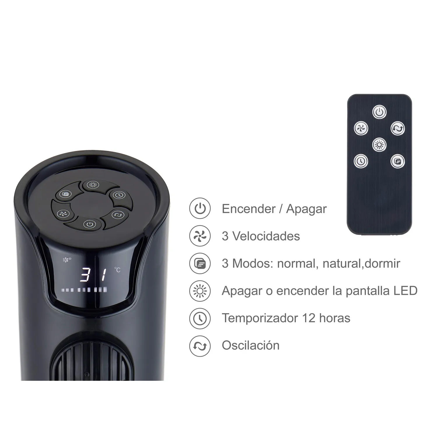 Este ventilador de torre cuenta con 3 velocidades para que ajustes la intensidad del aire a tu gusto, además de 3 modos: normal, natural y dormir. Su panel de control digital te permite manejarlo fácilmente, y gracias a su oscilación, el aire se distribuye uniformemente por toda la habitación. Fabricado con metal y plástico, es resistente y duradero. Con sus 45W de potencia, disfrutarás de una ventilación eficiente y un consumo energético moderado. Mide 98.5 cm de alto y 30 cm de ancho y profundidad, siendo perfecto para espacios de diferentes tamaños.